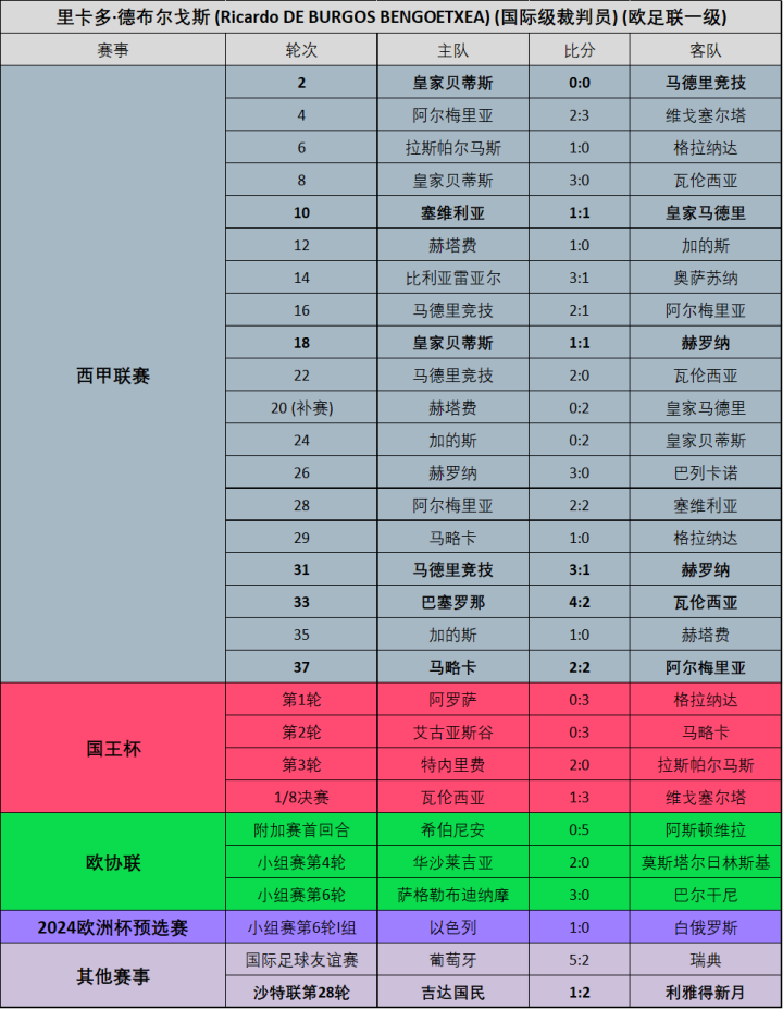 (图)23/24赛季德布尔戈斯各项赛事执法场次明细