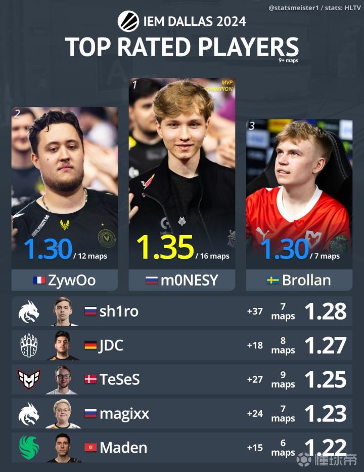 在IEM达拉斯2024落下帷幕之后,国外的数据爱好者统计了本次赛事选手rating,并汇总整理成了Top8排行榜。其中,该赛事MVP选手m0NESY在16张地图中打出1.35rating登顶榜首。