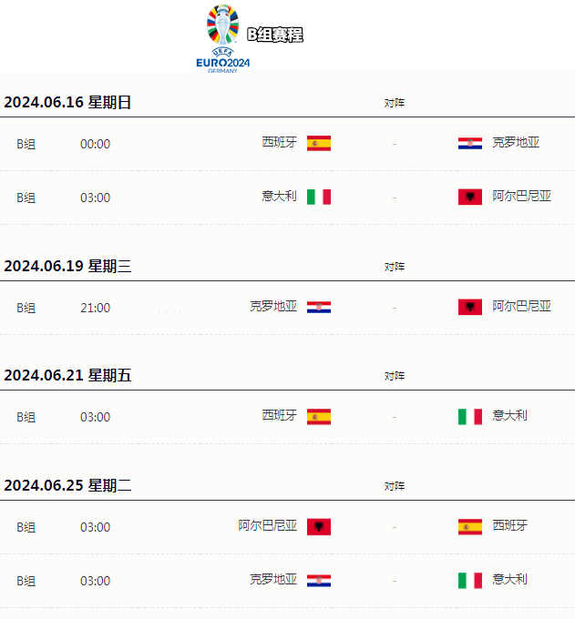 赛事卫冕冠军,三届欧洲杯冠军得主,上届世界杯季军,欧预赛勇夺小组第一的超级黑马……B组可谓是名副其实的死亡之组。西班牙实力突出但尚不具备碾压对手的能力,意大利的哀兵姿态令人难以捉摸,克罗地亚的优势和缺点都很突出,阿尔巴尼亚具备在90分总内拖住任何强敌的实力,B组三轮战罢后出现任何情况都不会令人感到太大意外。