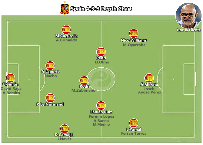 经历了世界杯时主打中后卫的尴尬,罗德里正式取代布斯克茨成为了操盘手,在他身后的是勒诺尔芒和拉波尔特,西班牙的防守硬度有了保障。另一位回归正轨的球员就是莫拉塔,他不用担心再度沦为无锋阵的牺牲品,尼科-威廉斯、亚马尔、奥亚萨瓦尔和费兰-托雷斯等边路攻击手需要中锋的掩护。