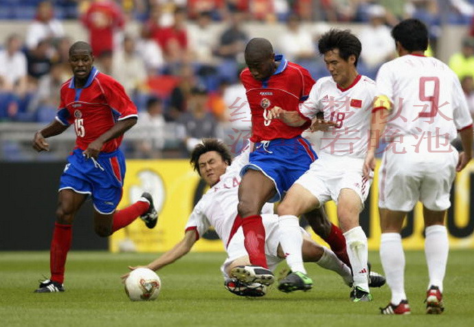 图片中,李玮峰飞身铲球,李霄鹏协防,背身的是马明宇,哥斯达黎加球员是万乔普和华莱士。