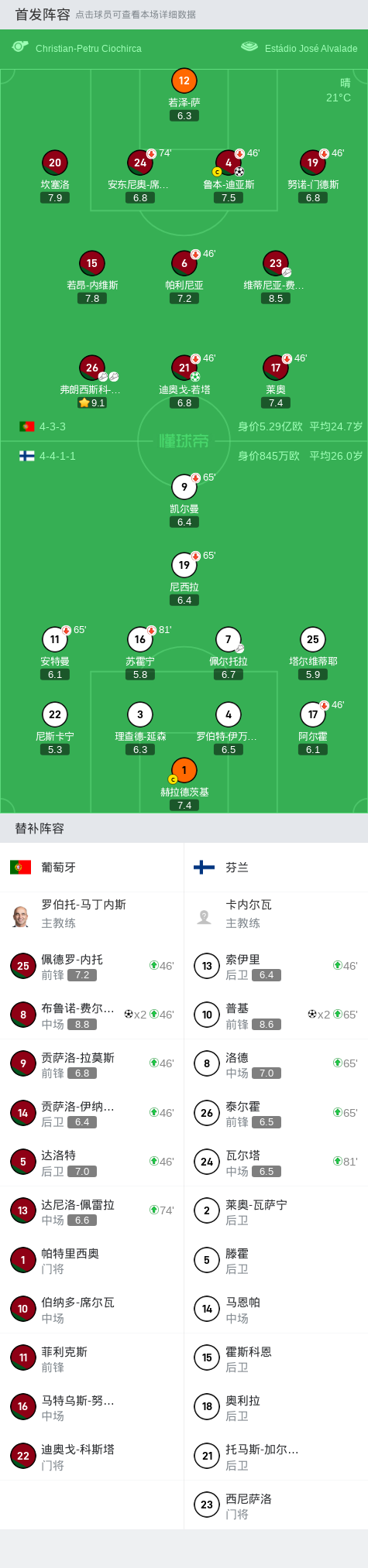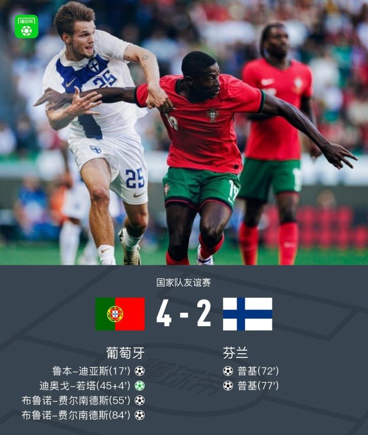 在国家队友谊赛中,葡萄牙主场迎战芬兰。上半场莱奥远射造险,鲁本-迪亚斯头球破门,坎塞洛爆射打偏,若塔点射扩大比分,下半场B费远射建功,普基梅开二度,B费双响锁定胜局。最终比分为葡萄牙 4-2 芬兰。