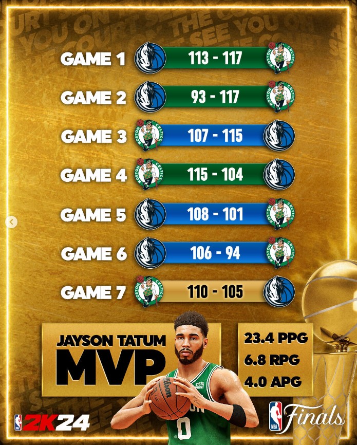 2K官方的模拟结果为,凯尔特人通过7场苦战总比分4比3击败独行侠获得了总冠军。