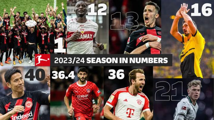 德甲本赛季的一些关键数字: 0-德甲历史上第一支赛季不败的球队 1-勒沃库森第29轮获得队史第一座德甲冠军 1.5-波鸿球员帕西恩西亚在第8轮攻入了本赛季最难的进球(xG值1.5%) 2-斯塔尼希奇是德甲历史上第二位连续两年代表不同球队夺冠的球员(第一位是谁?) 2-霍芬海姆vs法兰克福,德甲历史上首次两队门将都有助攻出现(98年开始统计助攻数据以来) 7-塞巴斯蒂安·波尔特第20轮代表达姆施塔特出场,追平了德甲代表不同7家俱乐部出场纪录 8-拜仁8比0达姆施塔特,本赛季最大胜利 12-吉拉西本赛季首开纪录的进球为12球,追平了盖德穆勒1969/70赛季的纪录 13-本赛季德甲帽子戏法次数,其中三分之一来自凯恩,德甲史上首位首赛季4次帽子戏法的球员 13-本赛季助攻王格里马尔多的助攻数 13-德甲历史上第13支夺冠的球队-勒沃库森 14-吉拉西前8场14球,刷新德甲纪录 15-穆勒成为首位代表拜仁在连续15个赛季都有进球的球员 16-胡梅尔斯连续16个赛季都有进球,此前只有托恩、佐尔克等五位传奇球星 18-和上赛季一样,特尔依然是德甲本赛季最年轻进球球员 21-罗宾·哈克对阵斯图加特仅用21秒进球是本赛季最快进球 24-勒沃库森本赛季仅失24球 24-凯恩前20轮比赛攻入24球追平莱万纪录 28-第18轮,不莱梅自2008年9月以来首次击败拜仁,结束了28场不胜拜仁的历史 29-胡梅尔斯参加德国国家德比的次数,刷新纪录 36-凯恩本赛季36也是其个人职业生涯最高纪录 36.4-本赛季德甲最快速度,阿方索·戴维斯、丁克奇、克瑙夫都达到了这个速度 40-桑乔凭借第31轮的进球成为德甲历史上进球最多的英格兰球员,或许下赛季就将被打破 42-第9轮德甲总共打进42球,是1983/84赛季以来单轮联赛最多进球的一轮 51-勒沃库森在本赛季前51场比赛中未尝败绩,这是欧足联成立以来的首次 56-多特蒙德自2020年6月以来,创造了主场连续56场进球纪录,直至第10轮0比4拜仁 65-本赛季第17轮,拜仁主场连续65场进球纪录终止 69-拜仁本赛季取得了对斯图加特第69场胜利,此前从未德甲球队战胜过某一国内对手如此多次 78-勒沃库森5比1法兰克福是两队德甲第78次教授,两队从未产生过平局 86-达姆施塔特创造了德甲单赛季失球纪录 90-勒沃库森夺冠的分数,仅次于2012/13由海因克斯带领的拜仁 94-拜仁本赛季共进了94球,比赛上赛季92还多2个 127-门兴球员奥诺拉特在第11轮的远射球速达到了127公里/小时,是本赛季最快的球速 139-本赛季德甲替补球员总进球数,排名历史第三 149-拜仁参与的比赛已经连续149场有进球,上一次0比0还是出现在2020年2月对阵莱比锡,这纪录仍然在刷新中 207-胡梅尔斯超越佐尔克成为多特队史获胜最多的球员 271-凯文·沃格特是德甲历史上进球荒最长的非门将球员,他上次德甲进球来自2014年1月,其间多达271场 292-赫拉德茨基在第32轮完成第292次德甲出场,没有一位外籍门将的出场次数比他更多,这纪录仍然在刷新中 344-布赖希在第12轮完成了自己执罚的第344场德甲,追平了德甲执罚纪录,可惜他随后因伤没有再次执罚 473-穆勒最后一轮联赛完成了这个数字,追平了迈尔的纪录 500-西马坎在第15轮的进球让莱比锡成为了德甲史上最快取得500球成就的球队,他们2016年才加入德甲 500-门兴第25轮3-3战平科隆成为德甲历史上首支取得500平的球队 500-第20轮,穆勒和拜仁一起取得了500场胜利(各项赛事) 700-德甲第28轮,穆勒成为迈尔之后第二位代表拜仁正式比赛出场超过700场的球员 985-本赛季德甲总进球数 2000-第24轮,拜仁成为德甲历史上首支出场次数达到2000场的球队,不莱梅在第32轮才达到这个成就