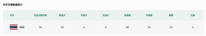数据统计显示,中国和泰国队一共交手了30场比赛,取得20胜4平6负,打进66球,丢了24球。