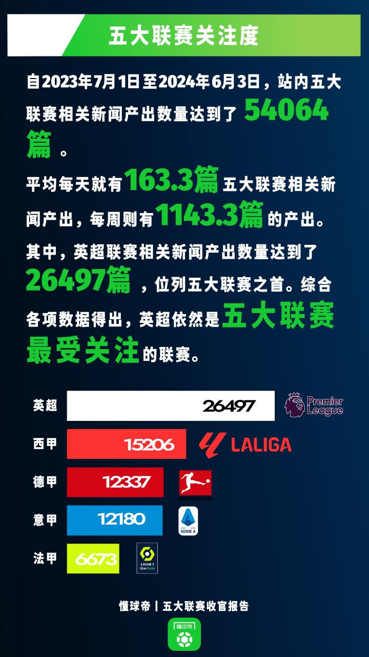 英超热度断崖式领跑,西甲不及其六成,德甲列第三懂球帝报告君 @懂球帝2024-06-05 21:35从2023年8月12日,到2024年6月3日,历经297个日夜,1752场比赛,欧洲五大联赛正式收官!谁是最具影响力的球星?谁是最有话题度的教练?哪个联赛、哪支球队有着最高的关注度?哪条新闻、哪场比赛最为炸裂?又有哪些数据令你感到意外,哪些纪录给你留下深刻印象?2023-24赛季五大联赛收官阶段,懂球帝即将推出《五大联赛收官报告》,带您从多个角度回顾23-24赛季,纪念又一个飞驰而过的赛季!展开更多