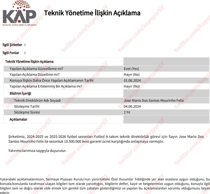 费内巴切昨日在KAP(伊斯坦布尔证券交易所的公众发布平台)公布了一份文件,其中透露了有关聘请新任主教练穆里尼奥的经济成本。在与穆里尼奥签下一份为期两年的合同之后,费内巴切将为其提供高达1050万欧元的年薪。不过在这份合同中,没有提及关于奖金的情况。