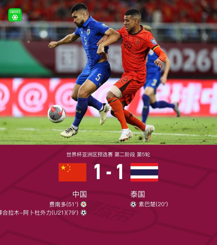 【中国1-1泰国积8分仍位列小组第二,拜合拉木扳平,费南多失点】
