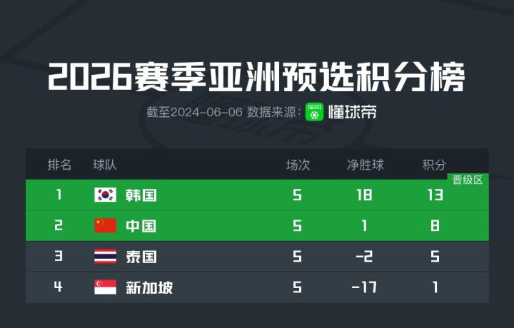 【世预赛积分榜:韩国13分头名出线,中国8分第二,泰国5分第三】