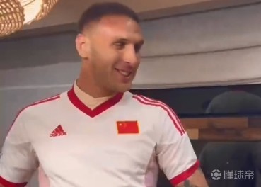 世预赛中国队vs泰国队比赛前夕,深圳新鹏城外援中卫杜加利奇穿上了国足2002年世界杯球衣,并且祝福中国队好运。