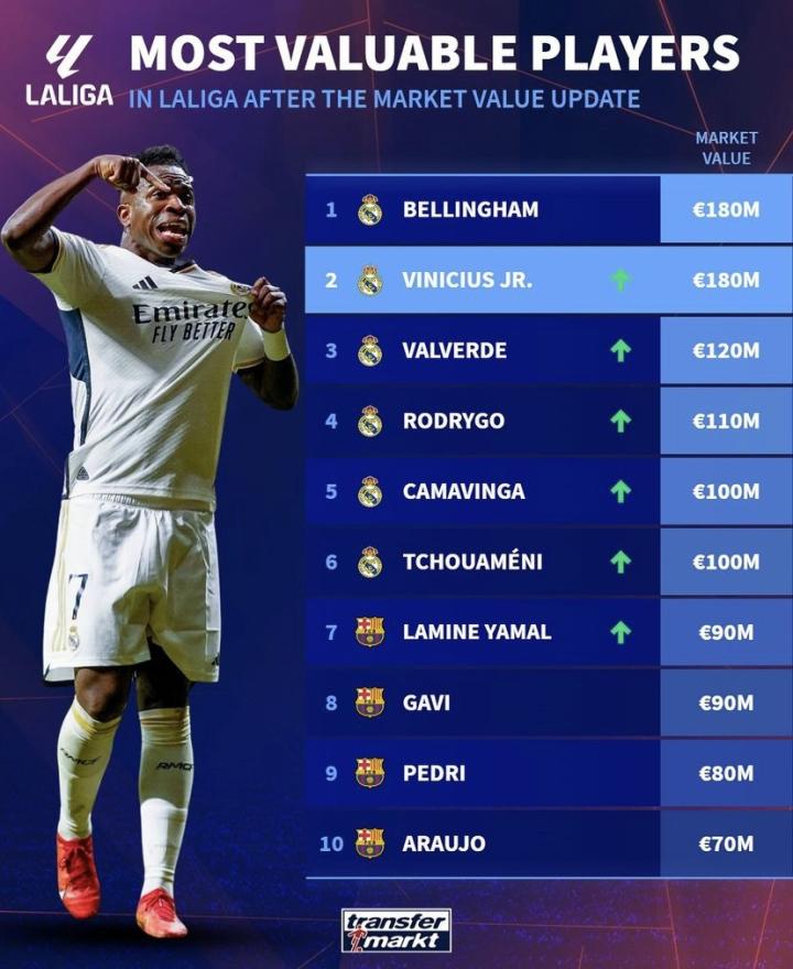 德转更新了西甲球员的身价,皇家马德里包揽前6名,维尼修斯身价上涨3000万欧元之后与贝林厄姆并列西甲乃至世界足坛第一。