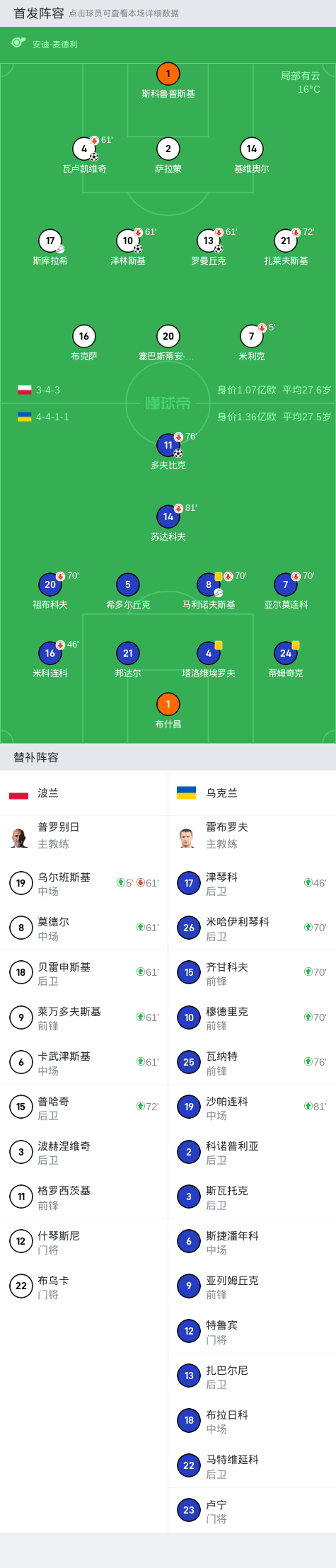 波兰3-1乌克兰,米利克开场5分钟伤退,泽林斯基破门