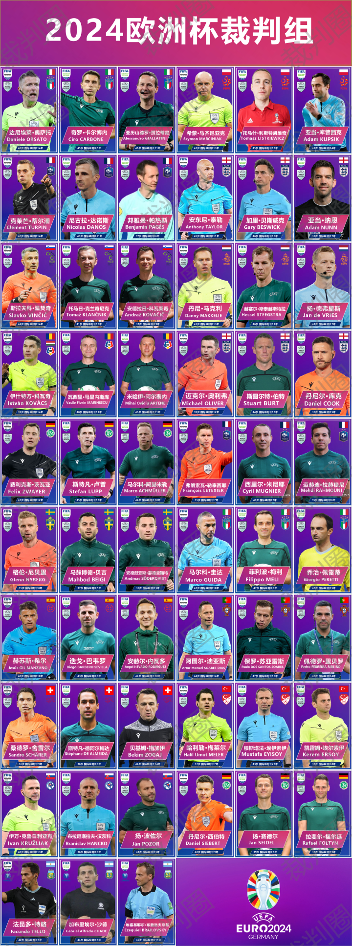 裁判圈2024欧洲杯共有19个场上裁判组,每组由1名裁判员和2名助理裁判员组成,上期《欧洲杯裁判巡礼》重点介绍了受邀执法的阿根廷裁判组,本期为大家带来意大利(奥萨托、圭达)、波兰(马齐尼亚克)、法国(蒂尔潘、勒泰西耶)、斯洛文尼亚(温契奇,本赛季欧冠决赛主裁)、罗马尼亚(科瓦奇,本赛季欧联决赛主裁)、瑞典(尼贝里)以及瑞士(舍雷尔)共计9个裁判组的详细介绍。