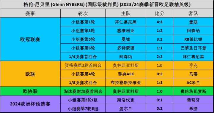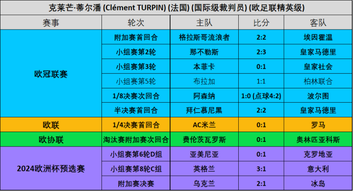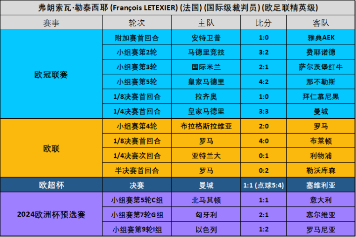 (图)23/24赛季勒泰西耶欧战执法场次明细