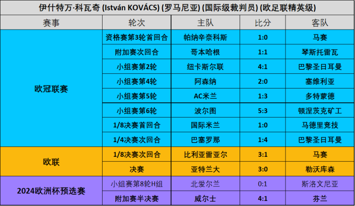 (图)23/24赛季科瓦奇欧战执法场次明细