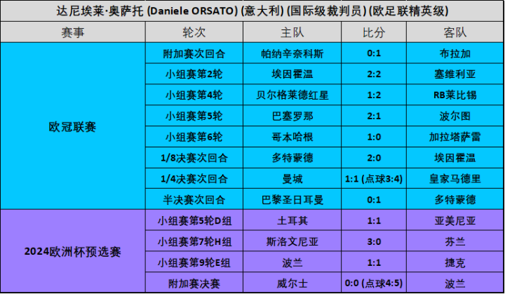 本赛季,奥萨托在欧战执法的比赛可谓场场关键——1场欧冠附加赛、4场欧冠小组赛、3场欧冠淘汰赛(均为次回合)、4场欧预赛(包括威尔士与波兰的附加赛决赛)。