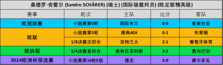 (图)23/24赛季舍雷尔欧战执法场次明细