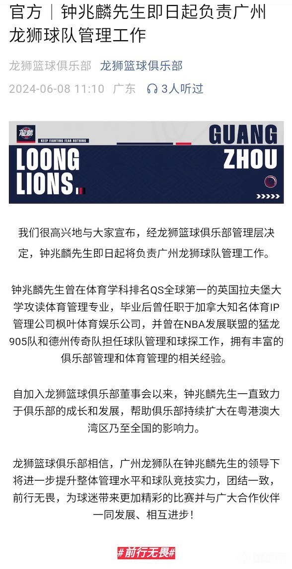 我们很高兴地与大家宣布,经龙狮篮球俱乐部管理层決定,钟兆麟先生即日起将负责广州龙狮球队管理工作。