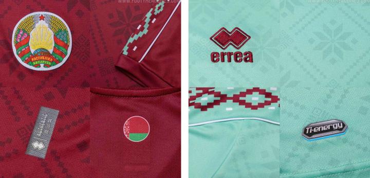 白俄罗斯球衣惯用色调为枣红色,在斯拉夫传统文化中代表生命、太阳和健康。球衣上的图案纹理来自东斯拉夫传统图案拉什尼克(Rushnyk)。