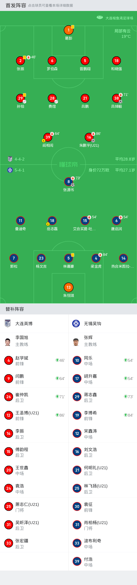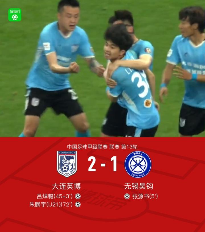 6月8日,中国足球甲级联赛第13轮,大连英博在主场迎战无锡吴钩。张源书开场5分钟闪击破门,阎相闯小角度造险,吕焯毅任意球扳平,下半场朱鹏宇头球被扑,随后朱鹏宇头球反超比分。最终,大连英博以2-1战胜无锡吴钩。