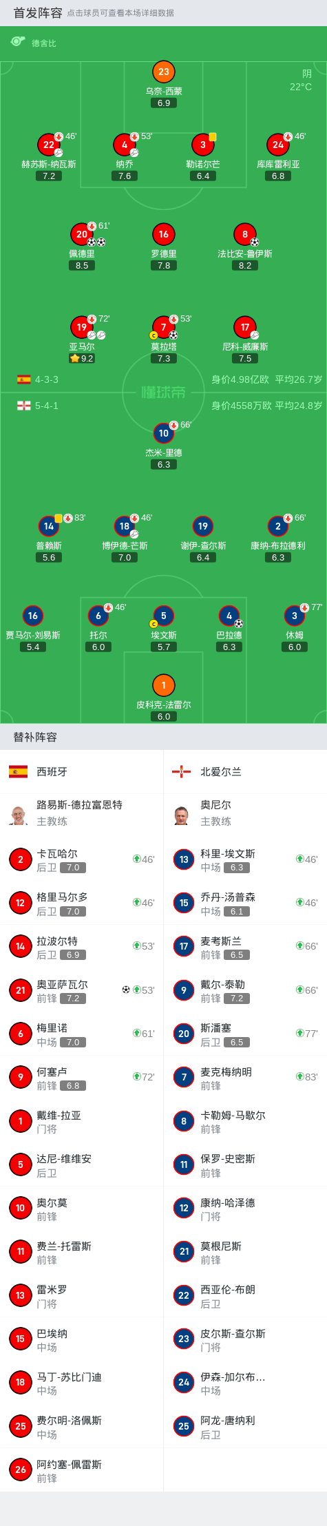 西班牙5-1逆转北爱尔兰,佩德里梅开二度,亚马尔助攻双响
