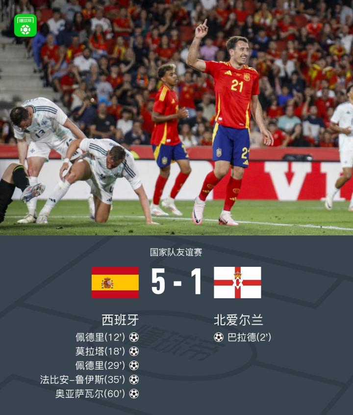 北京时间6月9日国家队友谊赛,西班牙主场对阵北爱尔兰。上半场开场仅2分钟,巴拉德头槌破门。随后,佩德里远射扳平比分。纳瓦斯助攻,莫拉塔头槌帮助斗牛士军团反超比分。尼科-威廉斯传球,佩德里再下一城。亚马尔助攻,鲁伊斯垫射得分。下半场,亚马尔抢断后助攻,奥亚萨瓦尔破门。全场比赛结束,西班牙5-1逆转北爱尔兰。