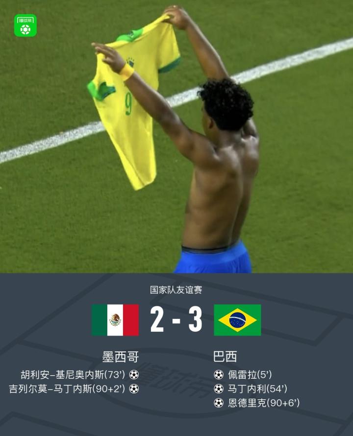 巴西3-2墨西哥,维尼修斯助攻恩德里克绝杀,马丁内利建功