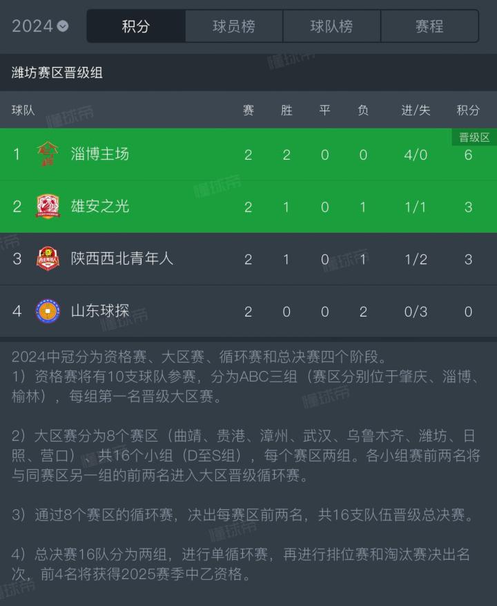 目前潍坊赛区晋级组已经进行了2轮比赛,淄博主场2战全胜排名第一,雄安之光凭借净胜球优势领先陕西西北青年人排名第二,后者第三,山东球探排名第四。
