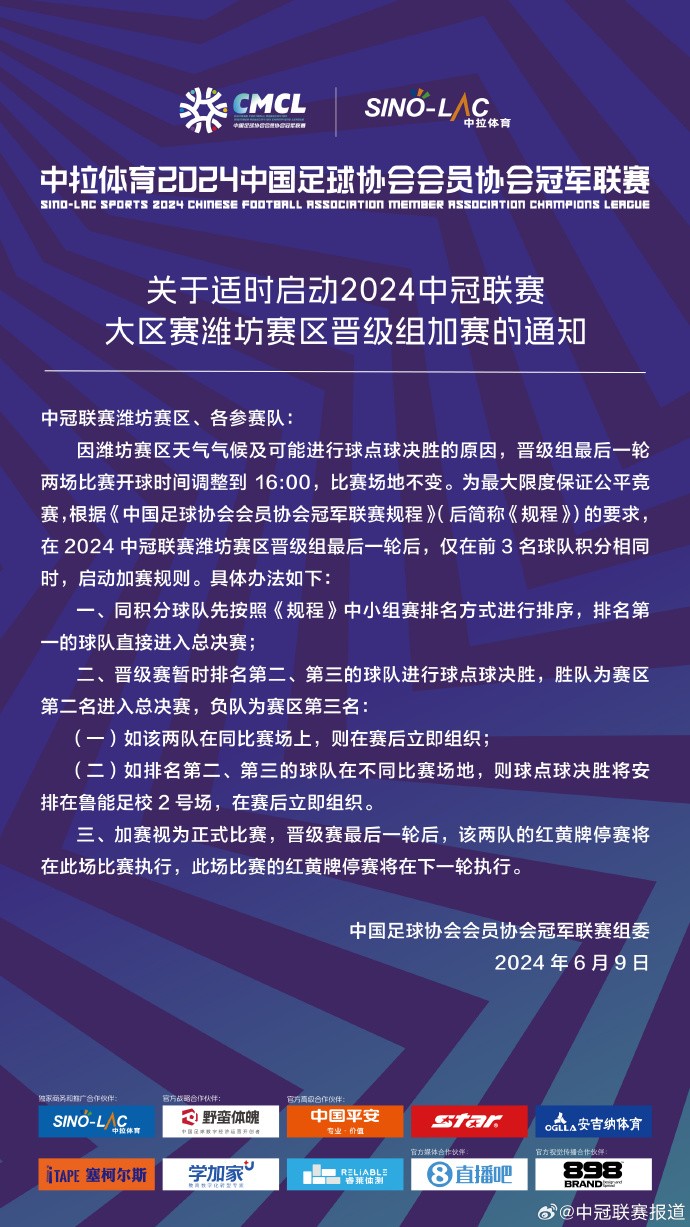 因潍坊赛区天气气候及可能进行点球决胜的原因,晋级组最后一轮两场比赛开球时间调整到16:00,比赛场地不变。为最大限度保证公平竞赛,根据《中国足球协会会员协会冠军联赛规程》(后简称《规程》)的要求,在2024中冠联赛潍坊赛区晋级组最后一轮后,仅在前3名球队积分相同时,启动加赛规则。具体办法如下: