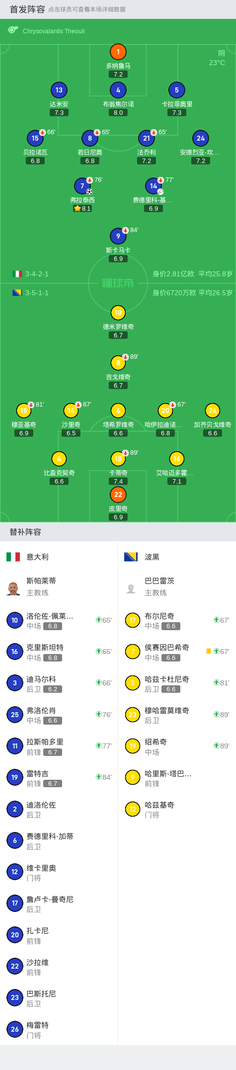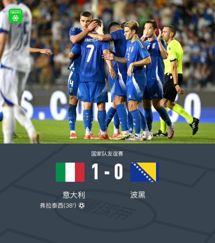北京时间6月10日国家队友谊赛,意大利主场对阵波黑。上半场尾声阶段,基耶萨左路传中,弗拉泰西凌空端射破门。下半场,意大利队屡屡造险,可惜都未有建树。最终比分,意大利 1-0 波黑。