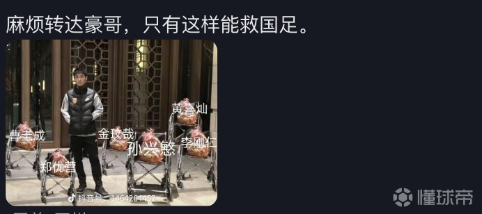 有网友将韩国国脚的形象p到了轮椅上,并评论道:“麻烦转达豪哥,只有这样能救国足。”