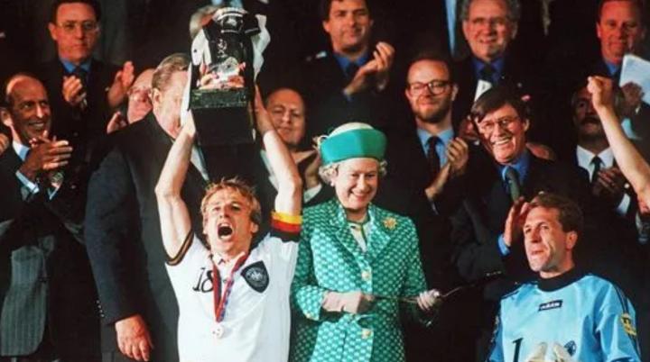 亮点:欧洲杯进一步扩军,采用了16支球队参赛的赛制。这也是英格兰首次举办欧洲杯,三狮军团希望像三十年前那样,借助东道主优势实现“足球回家”,可是宿敌德国队将他们挡在决赛大门之外。决赛中,伤兵满营的德国人又凭借坚定的意志将状态火热的捷克队拖入加时赛,给了比埃尔霍夫金球制胜的机会,戏剧般夺得第三次欧洲杯冠军。
