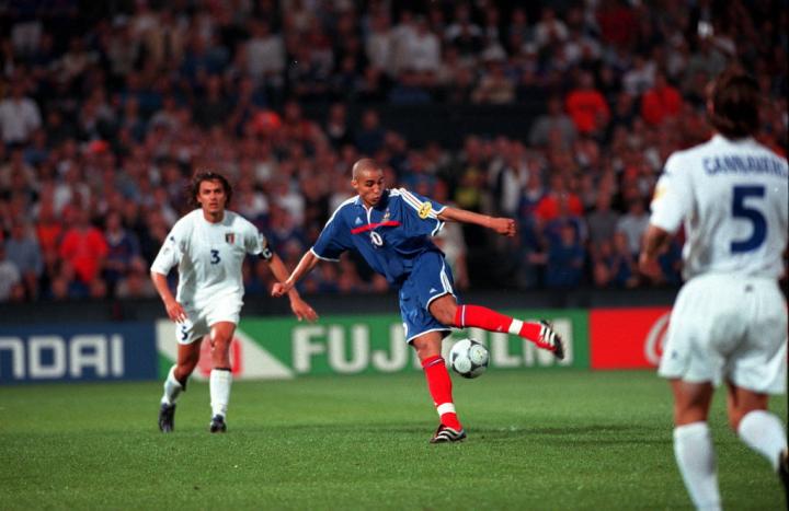 亮点:如日中天的法国队在98年世界杯上夺冠后又夺取欧洲杯冠军,改写了没有球队能连续夺取世界杯、欧洲杯的历史。决赛上高卢雄鸡几乎落后了一整场,最后时刻意大利钢铁防线还是犯下了错误,给了维尔托德扳平比分的机会,也给了特雷泽盖搭建了上演金球决胜戏码的舞台。