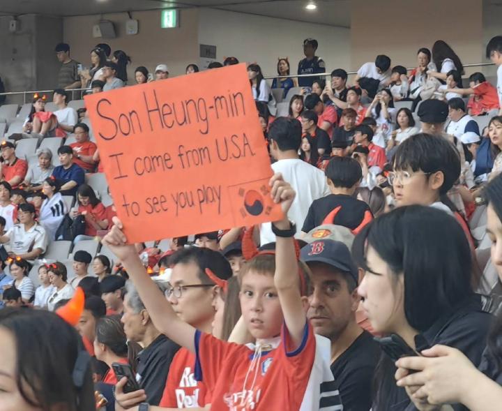 真爱,小球迷现场打出标语:孙兴慜,我从美国来看你比赛啦!