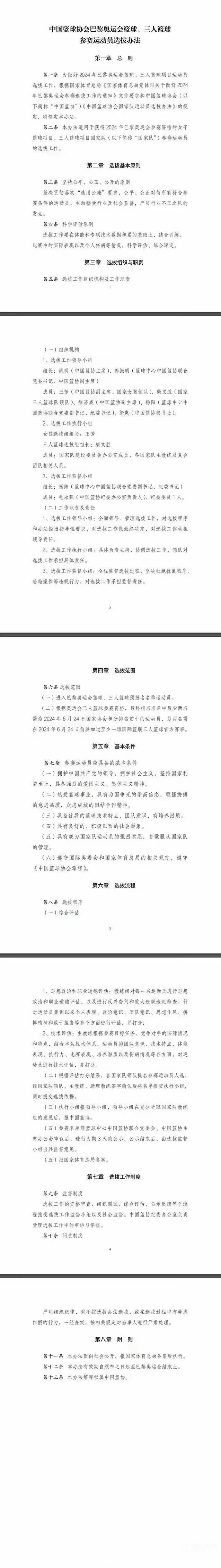 文件还详细规定了选拔的基本原则和选拔组织与职责,并指出根据奥运会三人篮球参赛资格,最终报名名单中最少两名需为2024年6月24日国家协会积分排名前十的运动员,另两名需在2024年6月24日前参加过至少一场国际篮联三人篮球官方赛事。