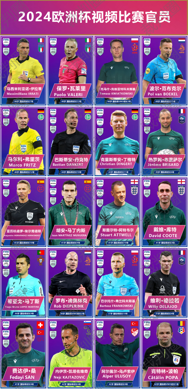 裁判圈VAR时代,视频比赛官员在比赛中所扮演的角色尤为重要。2024德国欧洲杯共有20名专职视频比赛官员,比上届欧洲杯多出3人,由“全球著名VAR”意大利人伊拉蒂领衔,瓦莱里、阿特韦尔、埃尔南德斯“平方”等名哨悉数入选。