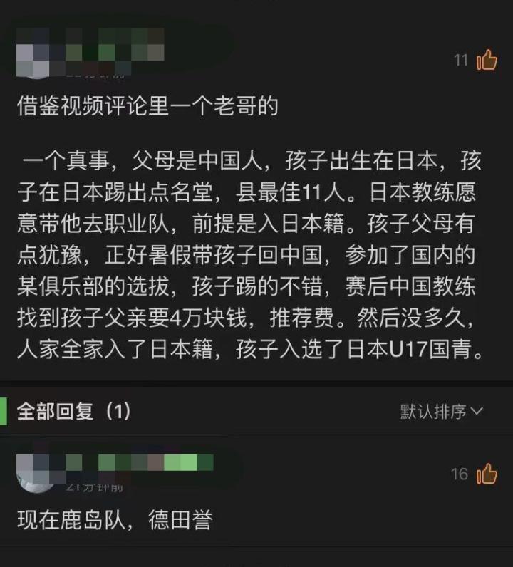 一切的开始,始于这个老哥在懂球帝上发布的这一段话,大致意思是:一个17岁天才足球少年,收到日本教练“去职业队”的邀请,但前提是“加入日本国籍”。少年一家人一开始拒绝了这个邀请,怀着爱国热情返回中国,要为中国足球效力,结果被教练索要四万块推荐费,因此少年一家人愤而加入了日本国籍,少年入选了日本U17国家队,而这位天才足球少年的名字叫“德田誉”。
