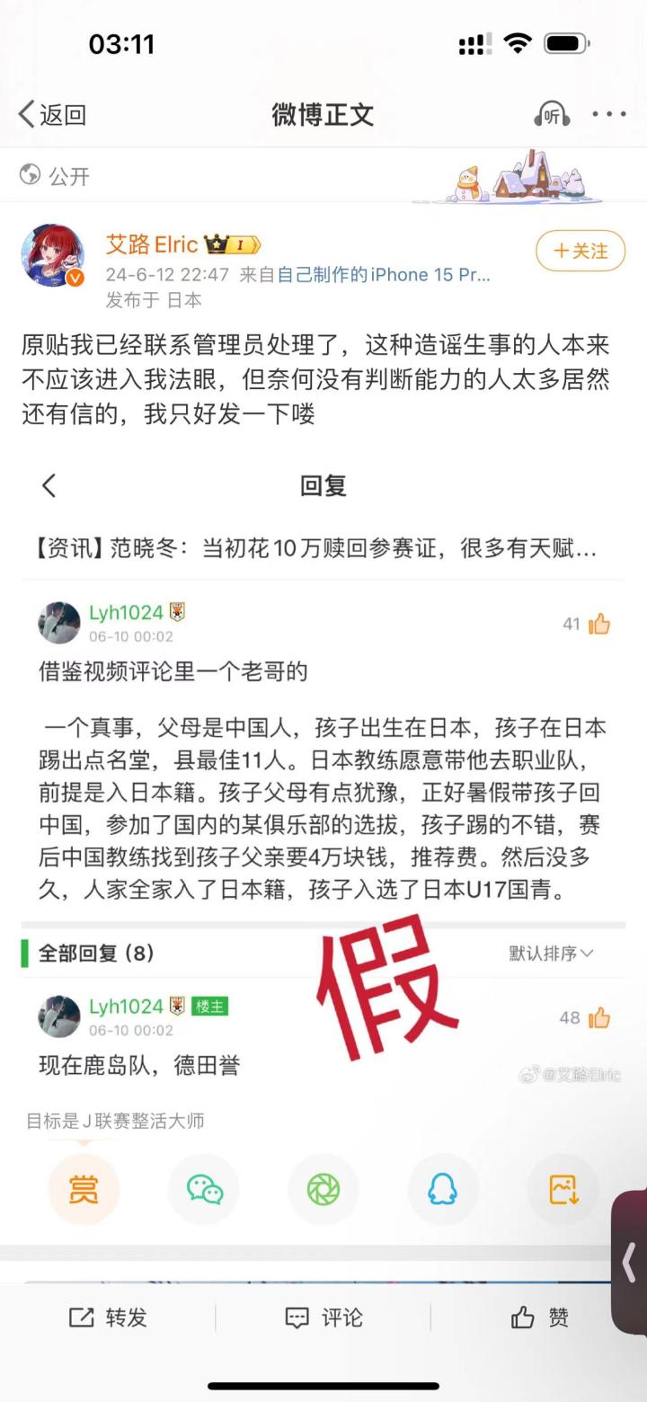 我在俱乐部球迷和青训球迷的帮助下,也找到了部分博主方面的消息,有的自称是德田誉的朋友,十分震惊于为什么自己的朋友突然变成中国人了。但是一般都不具备权威性,我们就不贴出来了。但是这也进一步的让我们质疑那位仁兄发出的假消息:德田誉曾经到底是不是中国人?