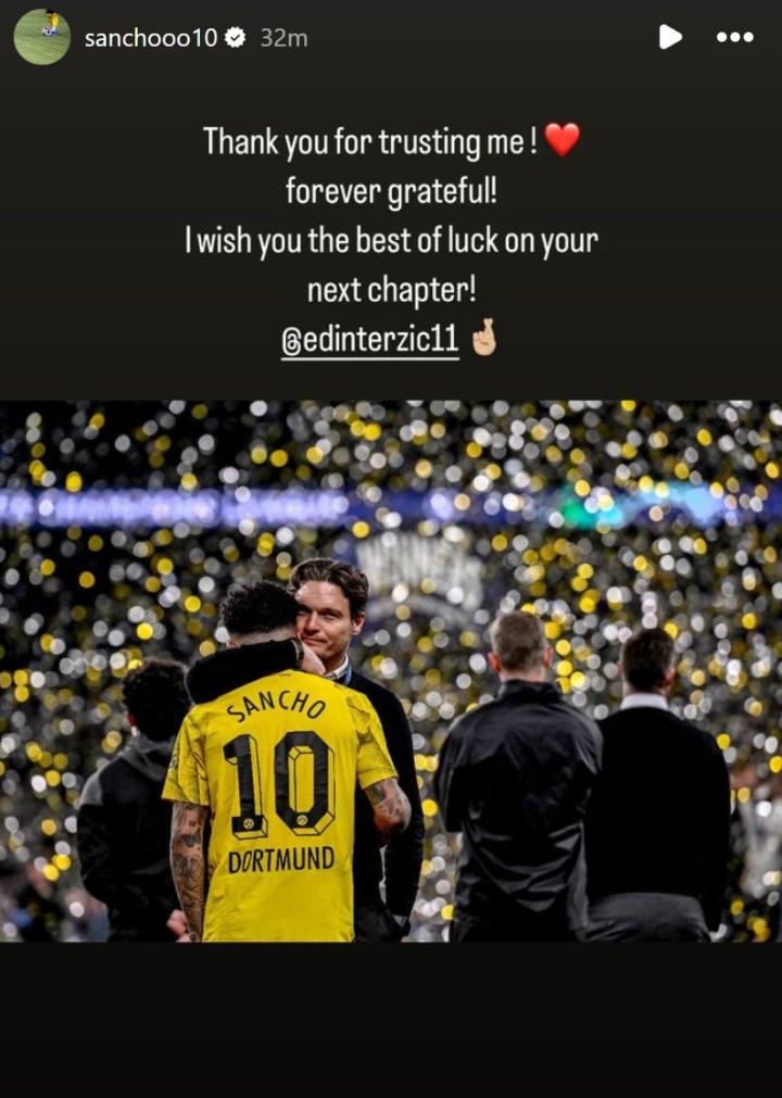 桑乔在个人社媒晒出了他和泰尔齐奇的合照,并写道:“谢谢你信任我!永远感激!祝你接下来一切顺利!”