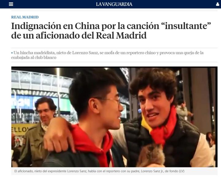 中国方面目前对皇家马德里感到愤怒,特别是一位皇马球迷的评论和态度,巧合的是俱乐部前任主席洛伦佐-桑斯孙子的行为引发了中国大使馆对皇马俱乐部的正式抗议。