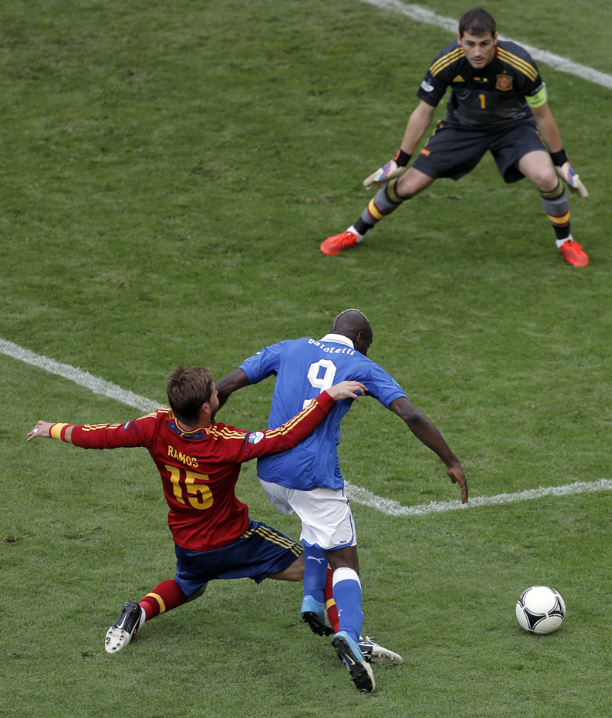首场比赛,意大利对阵卫冕冠军西班牙,蓝衣军团发挥非常不错,与西班牙无敌舰队斗得有来有往。下半场,巴洛特利等来了自己成名的机会,第五十三分钟拉莫斯回传失误,巴神机敏抢断形成单刀,可是他推进到禁区之后忽然放慢速度,不打门、不传球,等着拉莫斯回追将球破坏。