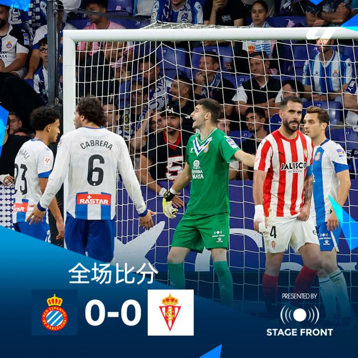 最终全场比赛结束,西班牙人0-0希洪体育。