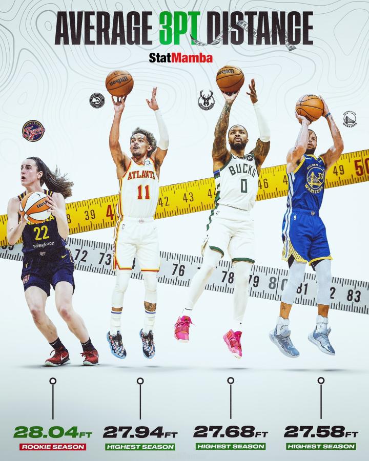 北京时间6月14日,美国媒体StatMamba晒出了一组数据统计,WNBA印第安纳狂热队球星凯特琳-克拉克平均三分球出手距离超多位NBA球星。