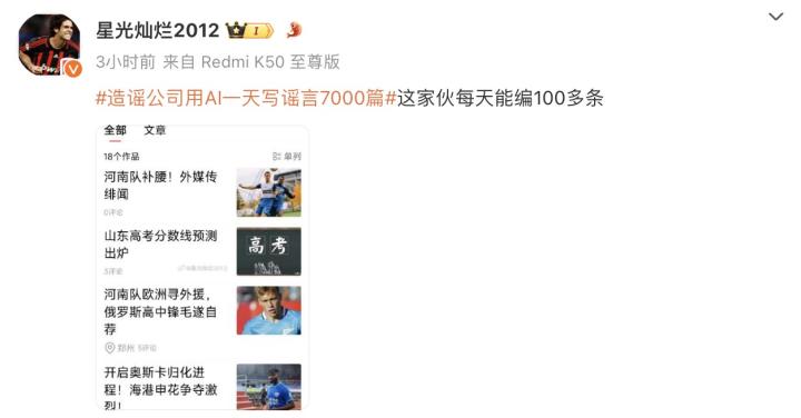 这一现象也蔓延到了足球圈。足球博主“星光灿烂2012”发文表示,某平台某足球内容创作者每天能利用AI编写100多条文章。