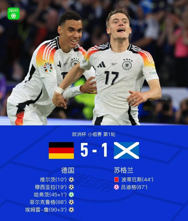 本届欧洲杯揭幕战,东道主德国队迎战苏格兰队。维尔茨、穆西亚拉、菲尔克鲁格、埃姆雷-詹和哈弗茨分别为德国队攻入进球,而吕迪格不幸打进了一粒乌龙球。苏格兰后卫波蒂厄斯送红点套餐。最终德国5-1十人苏格兰。