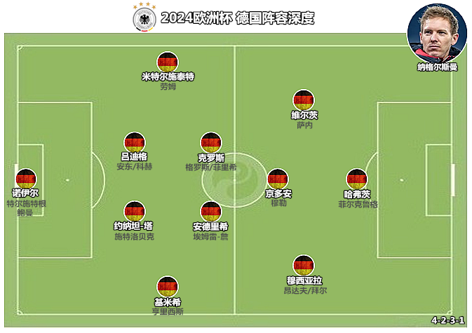 从首战苏格兰的情况来看,德国的全新中轴线通过了考验,风格互补的三中场配合非常默契,双核驱动边翼的进攻方式足以令所有对手胆寒。美中不足的是,安德里希还需要提升控制犯规(吃牌)的能力,苏格兰没有条件向德国后场施压,这个中场组合的抗压能力还有待检验。