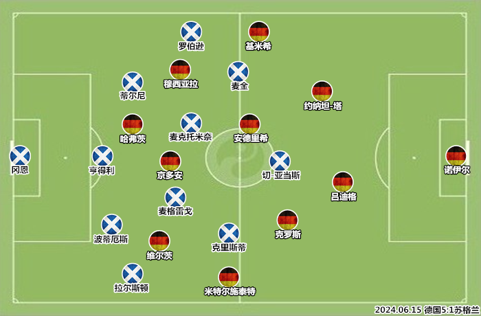 先是通过短距离带球吸引防守,然后再用斜长传找到弱侧的队友,克罗斯的踢法对苏格兰防线的拉扯效果非常明显,基米希和米特尔施泰特接球后都会第一时间寻找传中机会,持续加速就是对付大巴的最佳方式。开场阶段失误较多,德国首次成功的边中配合便取得了进球,京多安终于将俱乐部时期极为高效的“影锋”踢法带到了大赛舞台,在家乡父老面前打入首球对维尔茨的信心加持不容低估。