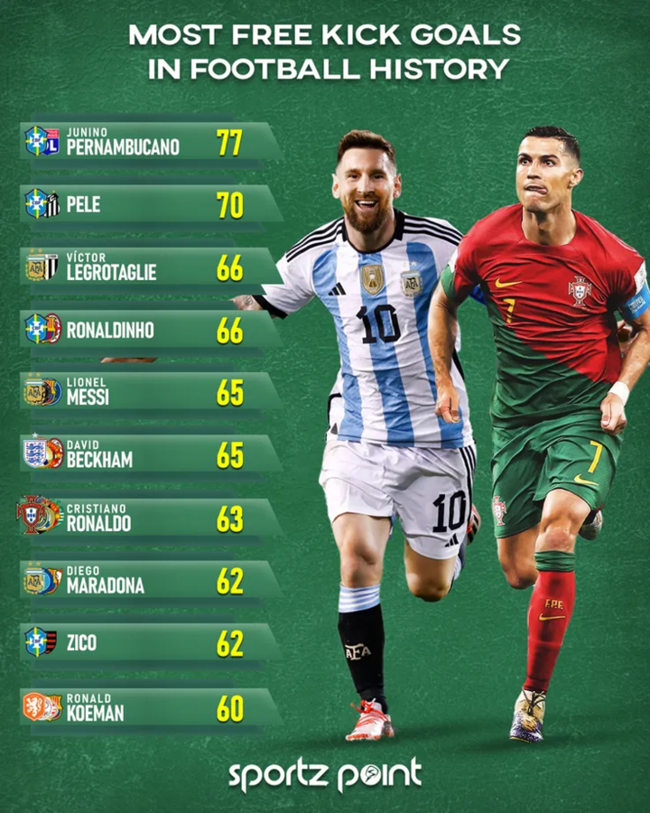 小儒尼尼奥在职业生涯打进过77个任意球,他几乎可以在任何位置以各种方式取得任意球,其诡异的任意球弧线让无数门将望球兴叹,堪称足球历史的任意球之王。而现役的任意球大师只有梅罗两人,那么梅西和C罗在退役后有超越小儒尼尼奥成为新王的可能吗?