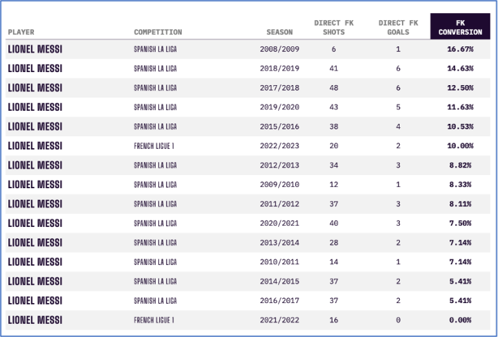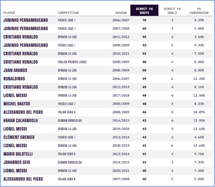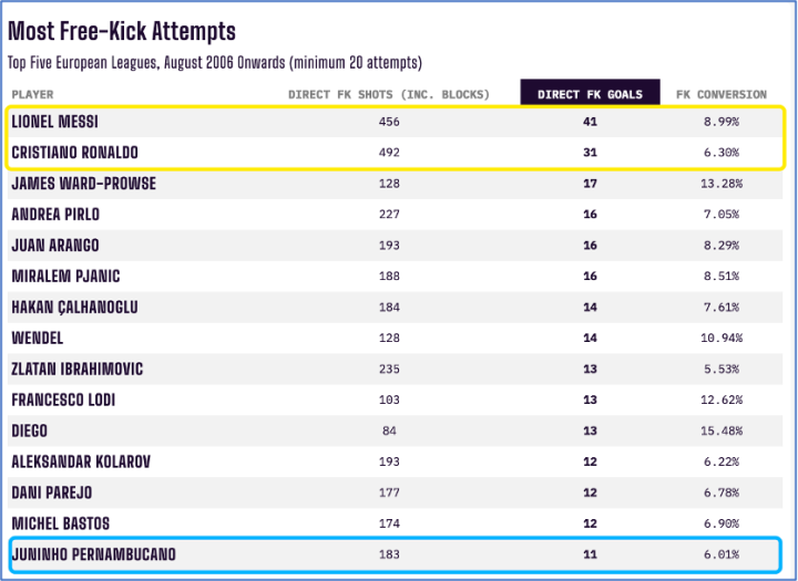 任意球进球效率很难统计,权威足球机构Opta曾统计过2006年8月至2024年2月,球员在五大联赛的任意球转化率,由于这几乎包含了梅罗整个职业生涯和小儒尼尼奥的巅峰期的一部分,因此可以用来参考: