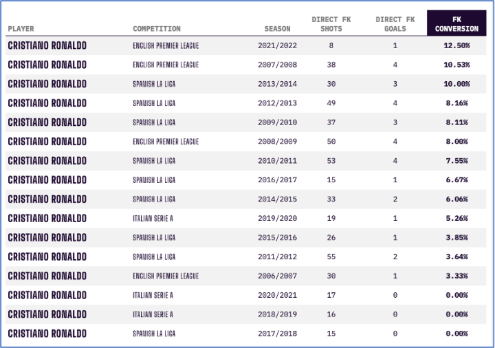 C罗任意球的巅峰期在2007/08赛季至2009/10赛季,转化率非常高。年纪大了之后就较少踢出“战斧”式任意球了。